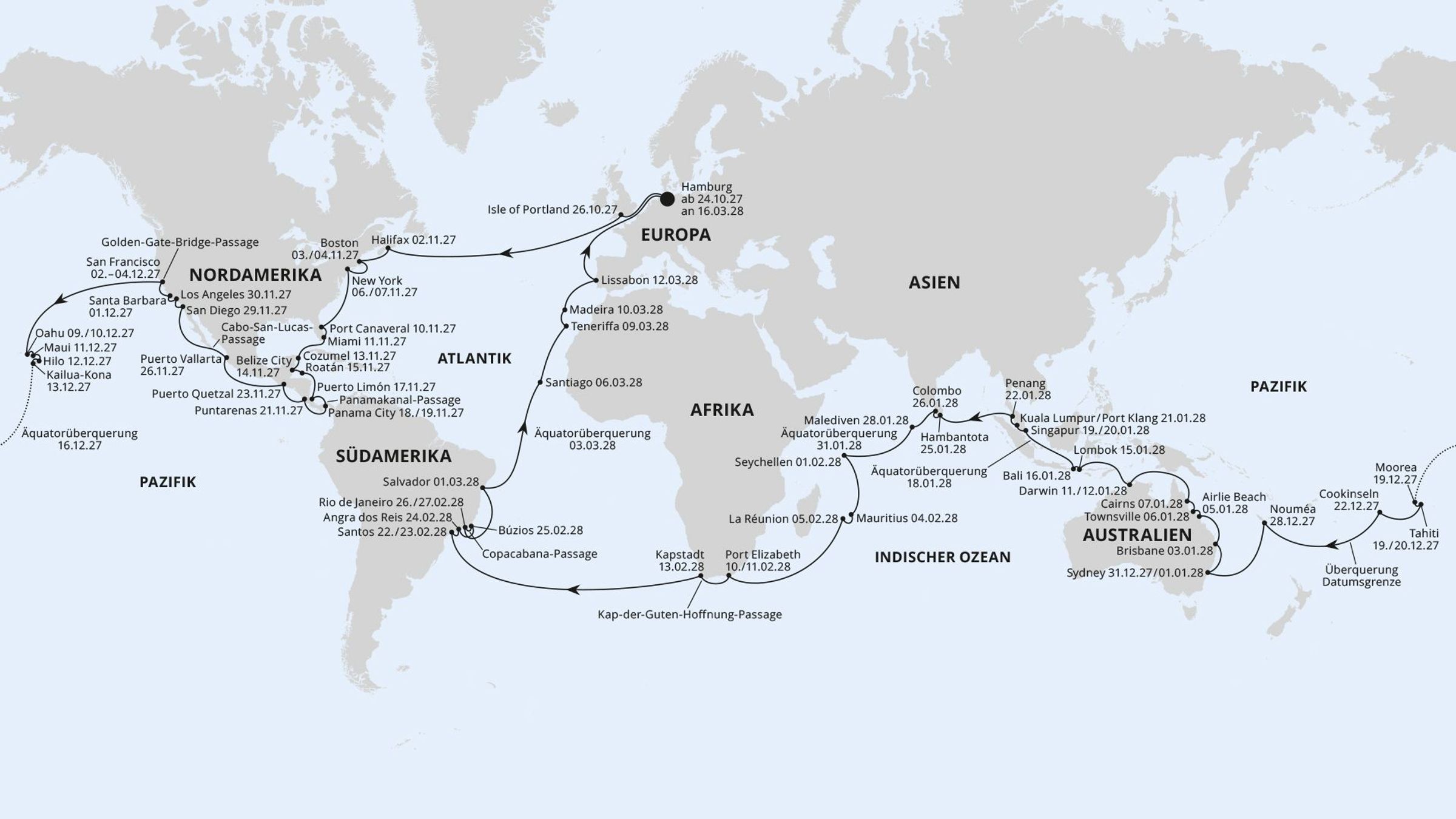 Die Reiseroute beginnt am 24. Oktober 2027 in Hamburg (Deutschland) und führt Sie vom 24. Oktober 2027 bis zum 16. März 2028 (144 Tage) wieder nach Hamburg (Deutschland).
